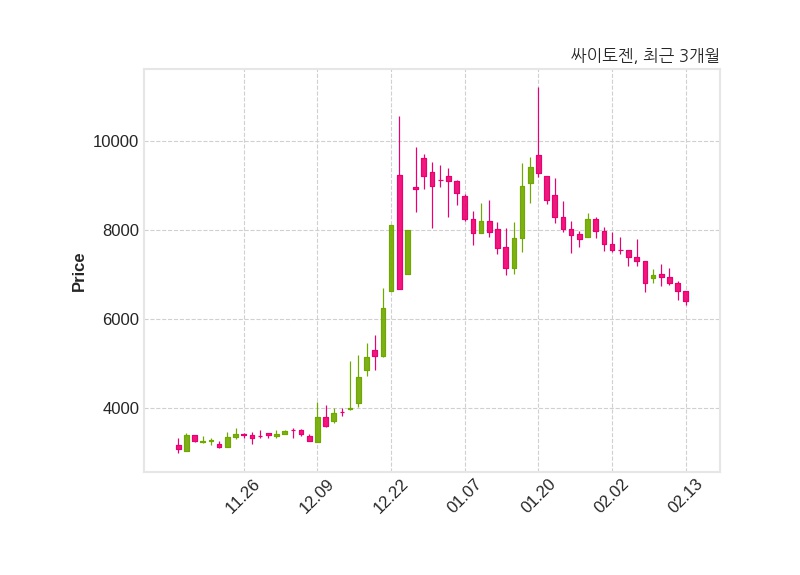 한편, 싸이토젠의 15시 04분 현재주가는 6,400원으로 직전 거래일 대비 220원(-3.32%) 하락이며, 거래량은 198,952주이다.