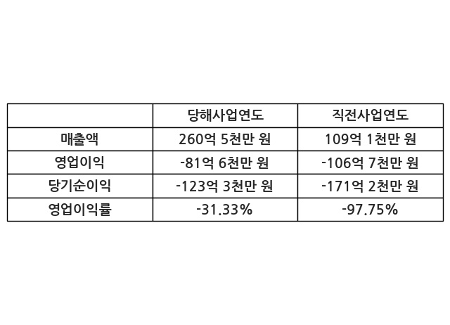 이번사업연도의 매출액은 직전사업연도 대비 138.8% 증가한 260억 5천만 원, 영업이익은 -81억 6천만 원, 당기순이익은 -123억 3천만 원이라고 공시했다.