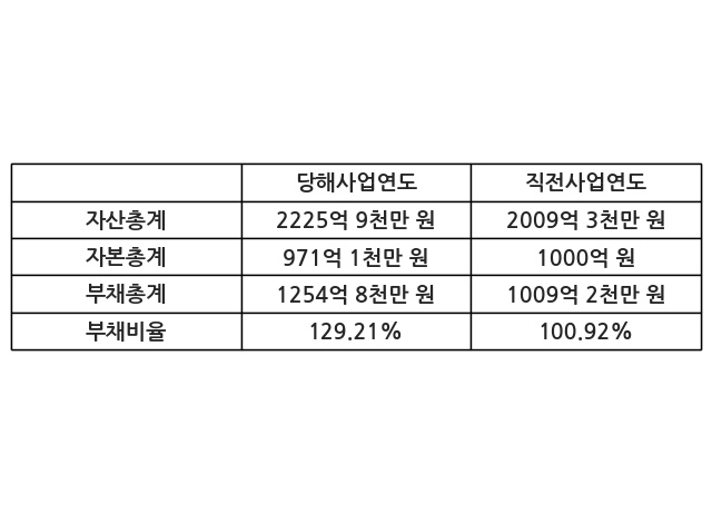 또한, 이번사업연도의 자산총계는 2225억 9천만 원으로 직전사업연도 대비 10.78% 증가한 한편, 부채총계는 1254억 8천만 원으로 24.33% 증가, 자본총계는 971억 1천만 원으로 -2.89% 감소했다.