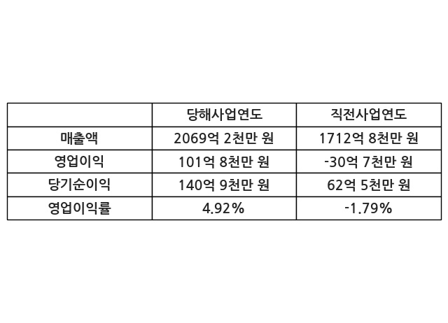이번사업연도의 매출액은 직전사업연도 대비 20.81% 증가한 2069억 2천만 원, 영업이익은 101억 8천만 원, 당기순이익은 140억 9천만 원이라고 공시했다.