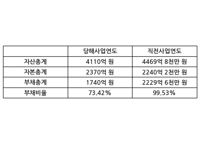 또한, 이번사업연도의 자산총계는 4110억 원으로 직전사업연도 대비 -8.05% 감소한 한편, 부채총계는 1740억 원으로 -21.96% 감소, 자본총계는 2370억 원으로 5.79% 증가했다.