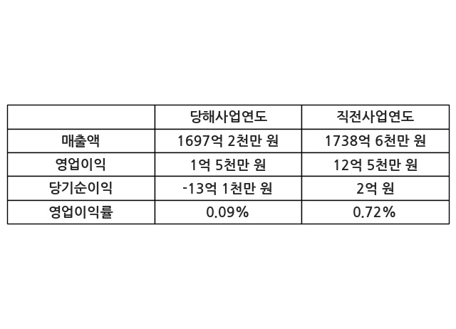 이번사업연도의 매출액은 직전사업연도 대비 -2.38% 감소한 1697억 2천만 원, 영업이익은 1억 5천만 원, 당기순이익은 -13억 1천만 원이라고 공시했다.