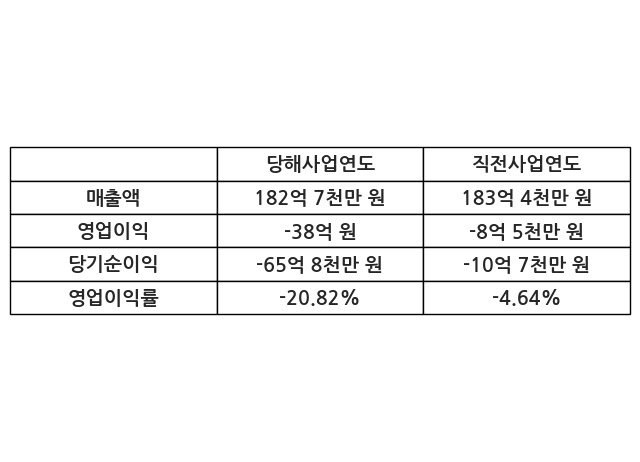 이번사업연도의 매출액은 직전사업연도 대비 -0.36% 감소한 182억 7천만 원, 영업이익은 -38억 원, 당기순이익은 -65억 8천만 원이라고 공시했다.