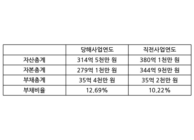 또한, 이번사업연도의 자산총계는 314억 5천만 원으로 직전사업연도 대비 -17.26% 감소한 한편, 부채총계는 35억 4천만 원으로 0.51% 증가, 자본총계는 279억 1천만 원으로 -19.07% 감소했다.