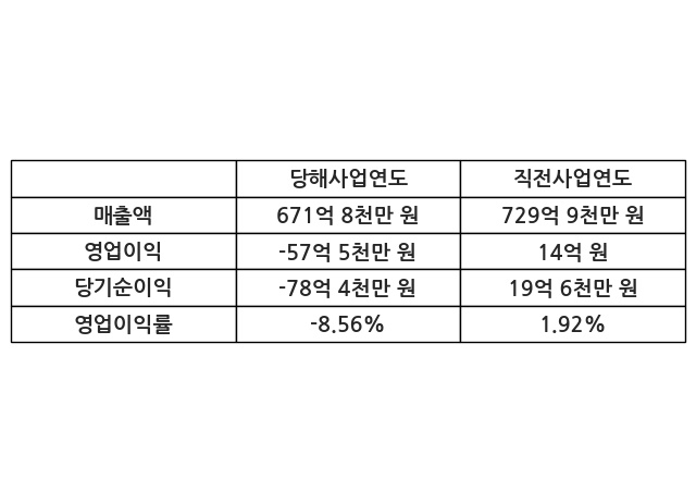 이번사업연도의 매출액은 직전사업연도 대비 -7.96% 감소한 671억 8천만 원, 영업이익은 -57억 5천만 원, 당기순이익은 -78억 4천만 원이라고 공시했다.
