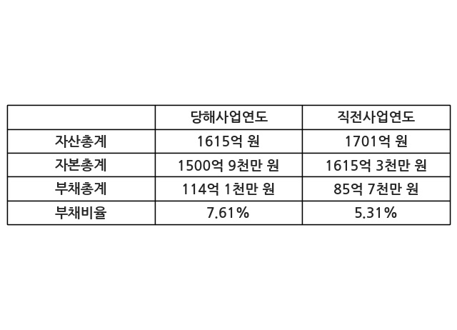 또한, 이번사업연도의 자산총계는 1615억 원으로 직전사업연도 대비 -5.05% 감소한 한편, 부채총계는 114억 1천만 원으로 33.12% 증가, 자본총계는 1500억 9천만 원으로 -7.08% 감소했다.