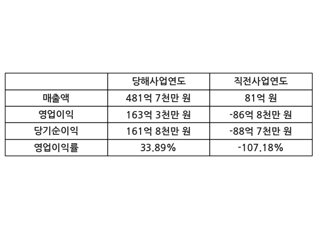 이번사업연도의 매출액은 직전사업연도 대비 494.72% 증가한 481억 7천만 원, 영업이익은 163억 3천만 원, 당기순이익은 161억 8천만 원이라고 공시했다.