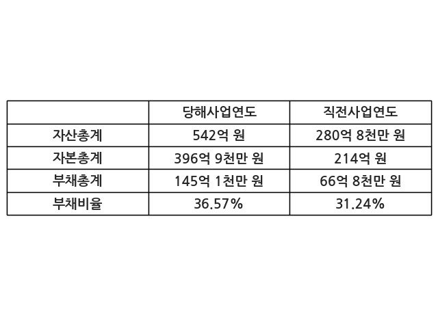또한, 이번사업연도의 자산총계는 542억 원으로 직전사업연도 대비 93.01% 증가한 한편, 부채총계는 145억 1천만 원으로 117.13% 증가, 자본총계는 396억 9천만 원으로 85.48% 증가했다.