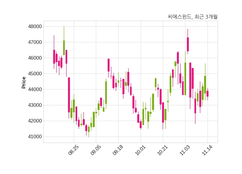한편, 씨에스윈드의 10시 12분 현재주가는 43,550원으로 직전 거래일 대비 1,300원(-2.9%) 하락이며, 거래량은 68,121주이다.