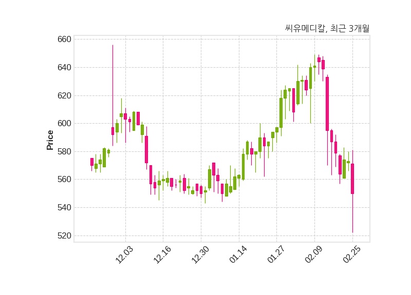 한편, 씨유메디칼은 장 마감 이후 해당 기업공시를 발표했으며 오늘 종가가 550원, 거래량은 3,276,143주로, 직전 거래일 대비 23원(-4.01%) 하락했다.