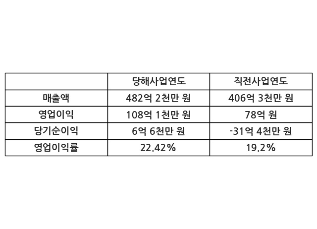 이번사업연도의 매출액은 직전사업연도 대비 18.69% 증가한 482억 2천만 원, 영업이익은 108억 1천만 원, 당기순이익은 6억 6천만 원이라고 공시했다.