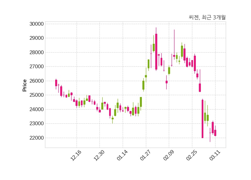 한편, 씨젠은 장 마감 이후 해당 기업공시를 발표했으며 오늘 종가가 22,150원, 거래량은 269,014주로, 직전 거래일 대비 200원(-0.89%) 하락했다.