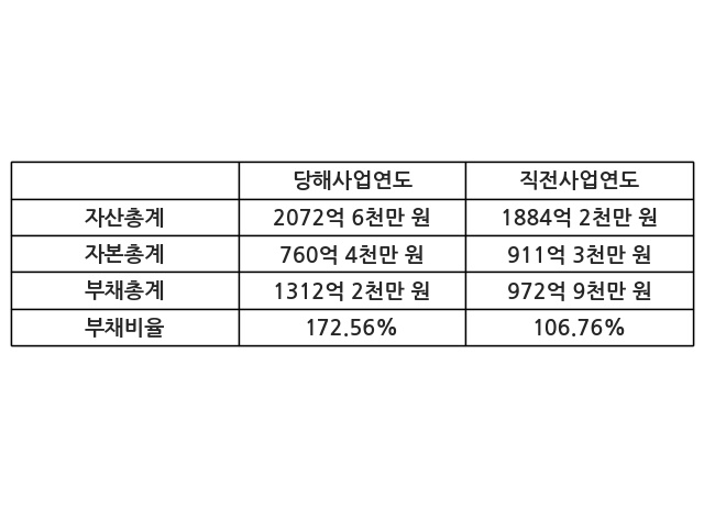또한, 이번사업연도의 자산총계는 2072억 6천만 원으로 직전사업연도 대비 10.0% 증가한 한편, 부채총계는 1312억 2천만 원으로 34.87% 증가, 자본총계는 760억 4천만 원으로 -16.56% 감소했다.