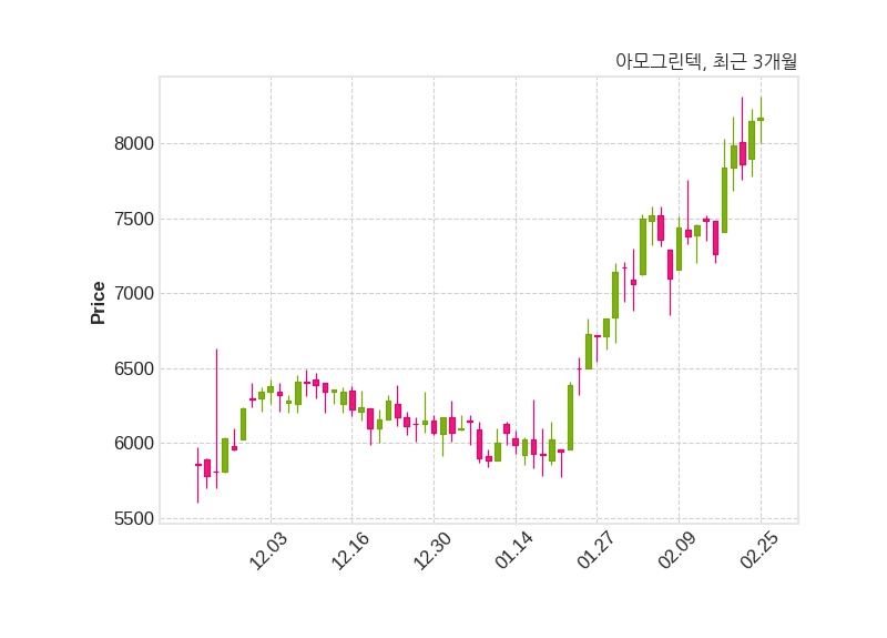 한편, 아모그린텍의 13시 47분 현재주가는 8,170원으로 직전 거래일 대비 20원(+0.25%) 상승이며, 거래량은 214,950주이다.