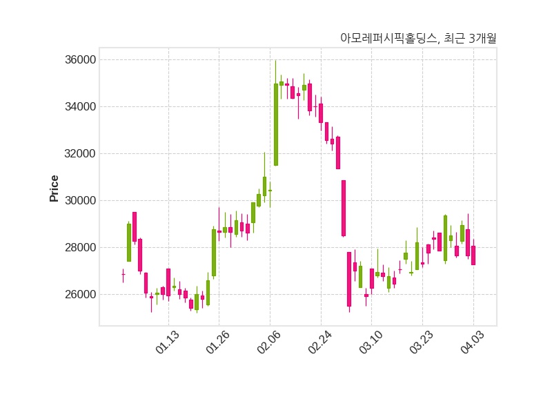 한편, 아모레퍼시픽홀딩스는 장 마감 이후 해당 기업공시를 발표했으며 오늘 종가가 27,250원, 거래량은 46,692주로, 직전 거래일 대비 400원(-1.45%) 하락했다.