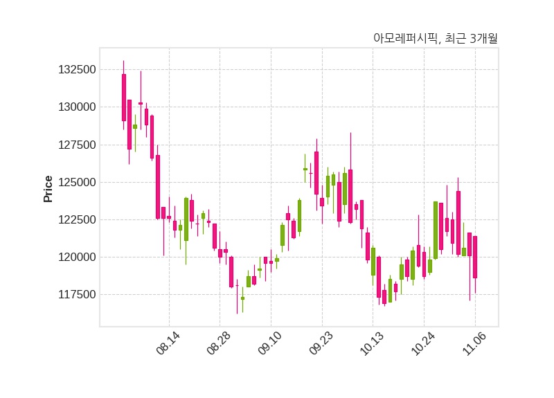 한편, 아모레퍼시픽은 장 마감 이후 해당 기업공시를 발표했으며 오늘 종가가 118,600원, 거래량은 199,021주로, 직전 거래일 대비 1,500원(-1.25%) 하락했다.