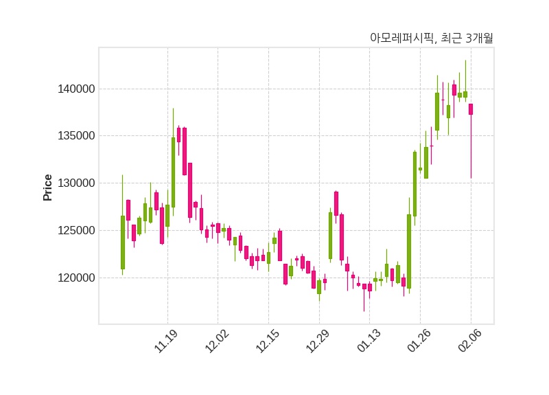 한편, 아모레퍼시픽은 장 마감 이후 해당 기업공시를 발표했으며 오늘 종가가 137,300원, 거래량은 199,172주로, 직전 거래일 대비 2,400원(-1.72%) 하락했다.