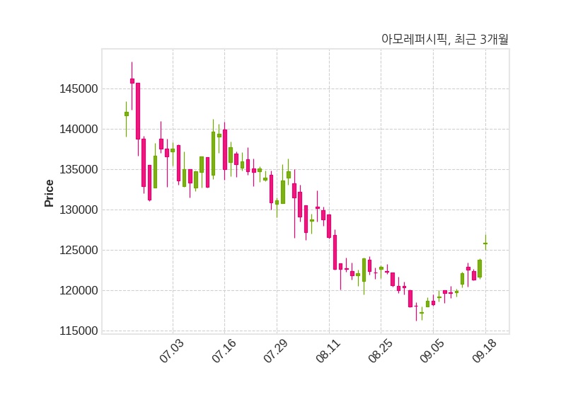 한편, 아모레퍼시픽은 장 마감 이후 해당 기업공시를 발표했으며 오늘 종가가 125,900원, 거래량은 207,718주로, 직전 거래일 대비 2,100원(+1.7%) 상승했다.