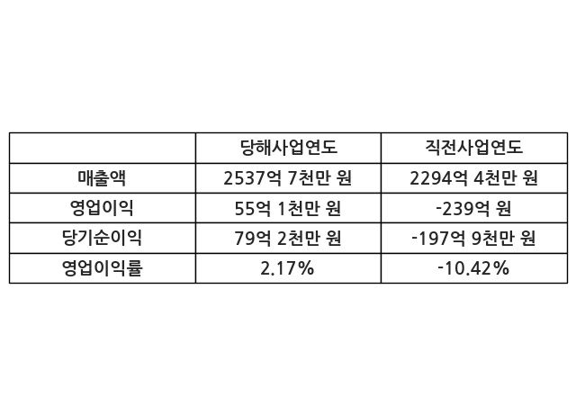 이번사업연도의 매출액은 직전사업연도 대비 10.6% 증가한 2537억 7천만 원, 영업이익은 55억 1천만 원, 당기순이익은 79억 2천만 원이라고 공시했다.