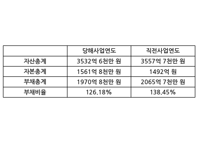 또한, 이번사업연도의 자산총계는 3532억 6천만 원으로 직전사업연도 대비 -0.7% 감소한 한편, 부채총계는 1970억 8천만 원으로 -4.59% 감소, 자본총계는 1561억 8천만 원으로 4.68% 증가했다.
