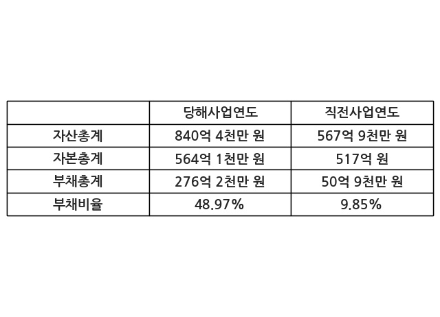 또한, 이번사업연도의 자산총계는 840억 4천만 원으로 직전사업연도 대비 47.98% 증가한 한편, 부채총계는 276억 2천만 원으로 442.31% 증가, 자본총계는 564억 1천만 원으로 9.13% 증가했다.