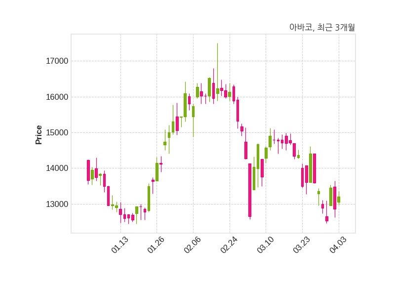 한편, 아바코는 장 마감 이후 해당 기업공시를 발표했으며 오늘 종가가 13,200원, 거래량은 82,666주로, 직전 거래일 대비 340원(+2.64%) 상승했다.