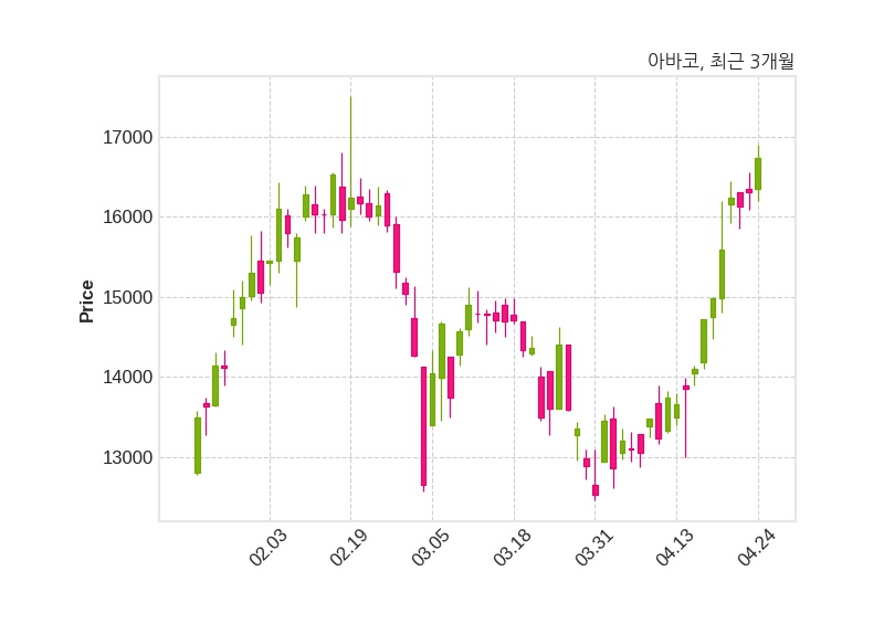 한편, 아바코의 14시 55분 현재주가는 16,730원으로 직전 거래일 대비 430원(+2.64%) 상승이며, 거래량은 325,124주이다.
