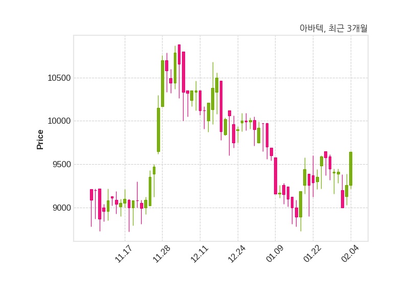 한편, 아바텍의 14시 50분 현재주가는 9,640원으로 직전 거래일 대비 380원(+4.1%) 상승이며, 거래량은 24,450주이다.