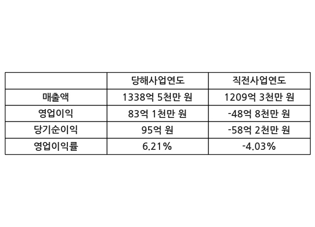 이번사업연도의 매출액은 직전사업연도 대비 10.69% 증가한 1338억 5천만 원, 영업이익은 83억 1천만 원, 당기순이익은 95억 원이라고 공시했다.