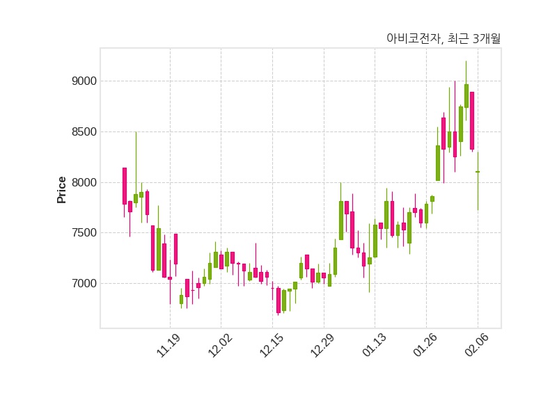 한편, 아비코전자의 15시 23분 현재주가는 8,110원으로 직전 거래일 대비 220원(-2.64%) 하락이며, 거래량은 90,277주이다.