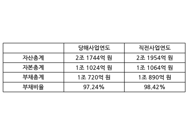 또한, 이번사업연도의 자산총계는 2조 1744억 원으로 직전사업연도 대비 -0.96% 감소한 한편, 부채총계는 1조 720억 원으로 -1.56% 감소, 자본총계는 1조 1024억 원으로 -0.36% 감소했다.