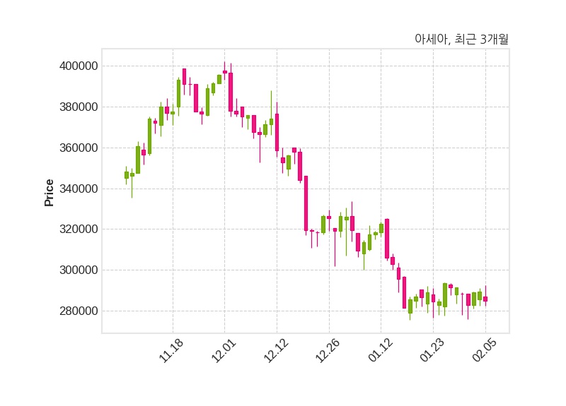 한편, 아세아의 15시 14분 현재주가는 285,000원으로 직전 거래일 대비 4,500원(-1.55%) 하락이며, 거래량은 2,225주이다.