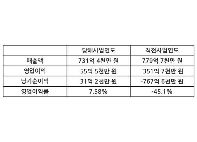 이번사업연도의 매출액은 직전사업연도 대비 -6.19% 감소한 731억 4천만 원, 영업이익은 55억 5천만 원, 당기순이익은 31억 2천만 원이라고 공시했다.