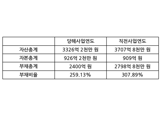 또한, 이번사업연도의 자산총계는 3326억 2천만 원으로 직전사업연도 대비 -10.29% 감소한 한편, 부채총계는 2400억 원으로 -14.25% 감소, 자본총계는 926억 2천만 원으로 1.89% 증가했다.