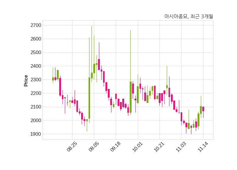 한편, 아시아종묘의 15시 11분 현재주가는 2,070원으로 직전 거래일 대비 35원(-1.66%) 하락이며, 거래량은 25,988주이다.