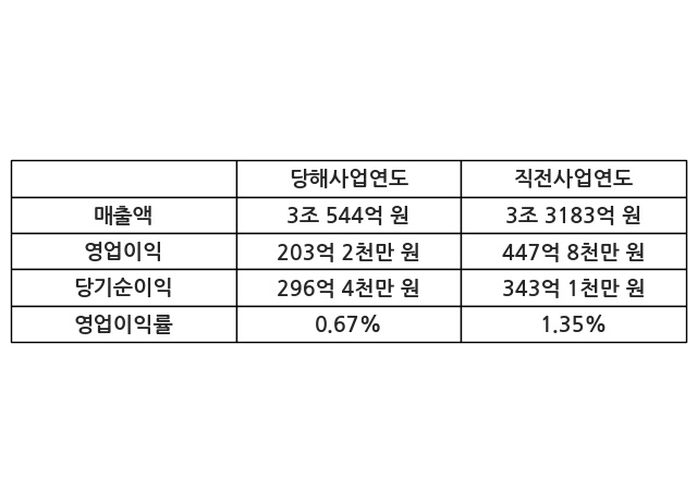 이번사업연도의 매출액은 직전사업연도 대비 -7.95% 감소한 3조 544억 원, 영업이익은 203억 2천만 원, 당기순이익은 296억 4천만 원이라고 공시했다.