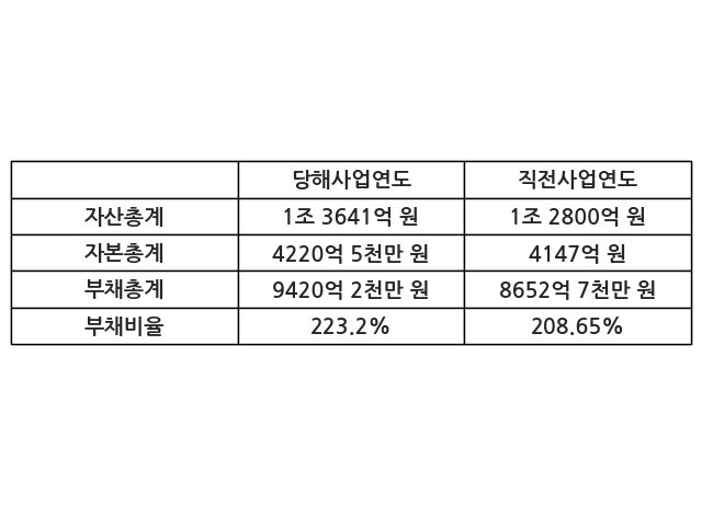 또한, 이번사업연도의 자산총계는 1조 3641억 원으로 직전사업연도 대비 6.57% 증가한 한편, 부채총계는 9420억 2천만 원으로 8.87% 증가, 자본총계는 4220억 5천만 원으로 1.77% 증가했다.