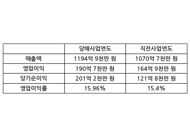 이번사업연도의 매출액은 직전사업연도 대비 11.6% 증가한 1194억 9천만 원, 영업이익은 190억 7천만 원, 당기순이익은 201억 2천만 원이라고 공시했다.