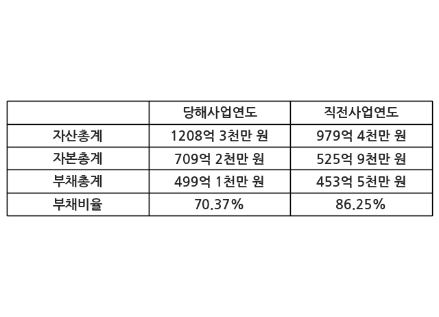 또한, 이번사업연도의 자산총계는 1208억 3천만 원으로 직전사업연도 대비 23.37% 증가한 한편, 부채총계는 499억 1천만 원으로 10.05% 증가, 자본총계는 709억 2천만 원으로 34.86% 증가했다.