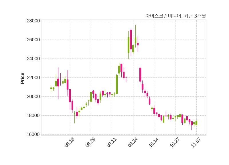 한편, 아이스크림미디어의 14시 11분 현재주가는 17,440원으로 직전 거래일 대비 150원(+0.87%) 상승이며, 거래량은 27,831주이다.