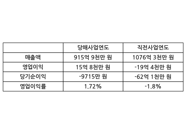 이번사업연도의 매출액은 직전사업연도 대비 -14.9% 감소한 915억 9천만 원, 영업이익은 15억 8천만 원, 당기순이익은 -9715만 원이라고 공시했다.