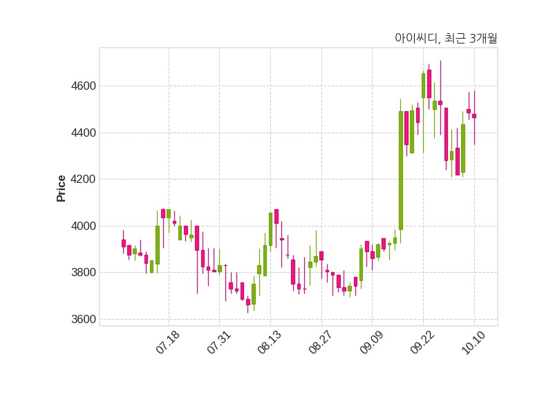 한편, 아이씨디의 10시 05분 현재주가는 4,465원으로 직전 거래일 대비 20원(-0.45%) 하락이며, 거래량은 35,492주이다.