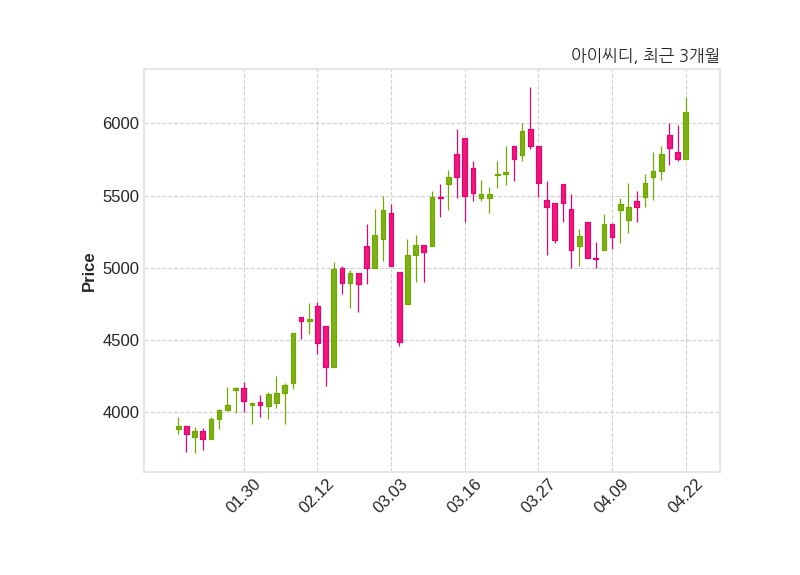 한편, 아이씨디의 11시 04분 현재주가는 6,080원으로 직전 거래일 대비 330원(+5.74%) 상승이며, 거래량은 191,623주이다.