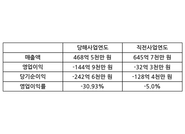 이번사업연도의 매출액은 직전사업연도 대비 -27.44% 감소한 468억 5천만 원, 영업이익은 -144억 9천만 원, 당기순이익은 -242억 6천만 원이라고 공시했다.