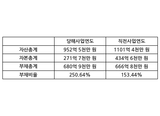 또한, 이번사업연도의 자산총계는 952억 5천만 원으로 직전사업연도 대비 -13.51% 감소한 한편, 부채총계는 680억 9천만 원으로 2.11% 증가, 자본총계는 271억 7천만 원으로 -37.49% 감소했다.