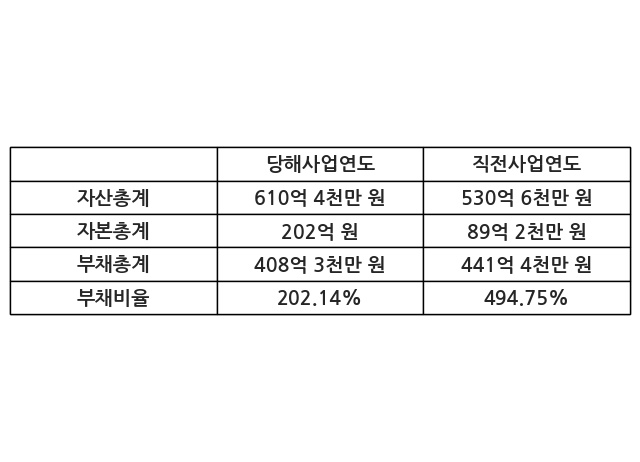또한, 이번사업연도의 자산총계는 610억 4천만 원으로 직전사업연도 대비 15.04% 증가한 한편, 부채총계는 408억 3천만 원으로 -7.48% 감소, 자본총계는 202억 원으로 126.45% 증가했다.