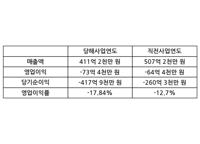 이번사업연도의 매출액은 직전사업연도 대비 -18.93% 감소한 411억 2천만 원, 영업이익은 -73억 4천만 원, 당기순이익은 -417억 9천만 원이라고 공시했다.