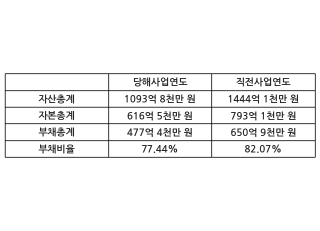또한, 이번사업연도의 자산총계는 1093억 8천만 원으로 직전사업연도 대비 -24.25% 감소한 한편, 부채총계는 477억 4천만 원으로 -26.66% 감소, 자본총계는 616억 5천만 원으로 -22.28% 감소했다.
