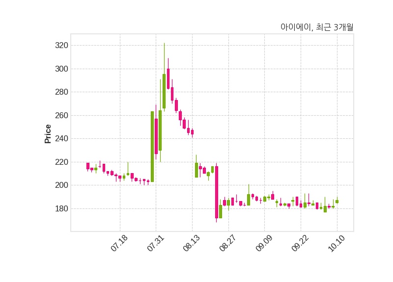 한편, 아이에이는 장 마감 이후 해당 기업공시를 발표했으며 오늘 종가가 187원, 거래량은 1,680,979주로, 직전 거래일 대비 5원(+2.75%) 상승했다.