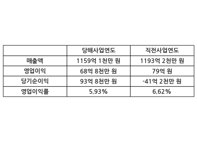 이번사업연도의 매출액은 직전사업연도 대비 -2.86% 감소한 1159억 1천만 원, 영업이익은 68억 8천만 원, 당기순이익은 93억 8천만 원이라고 공시했다.